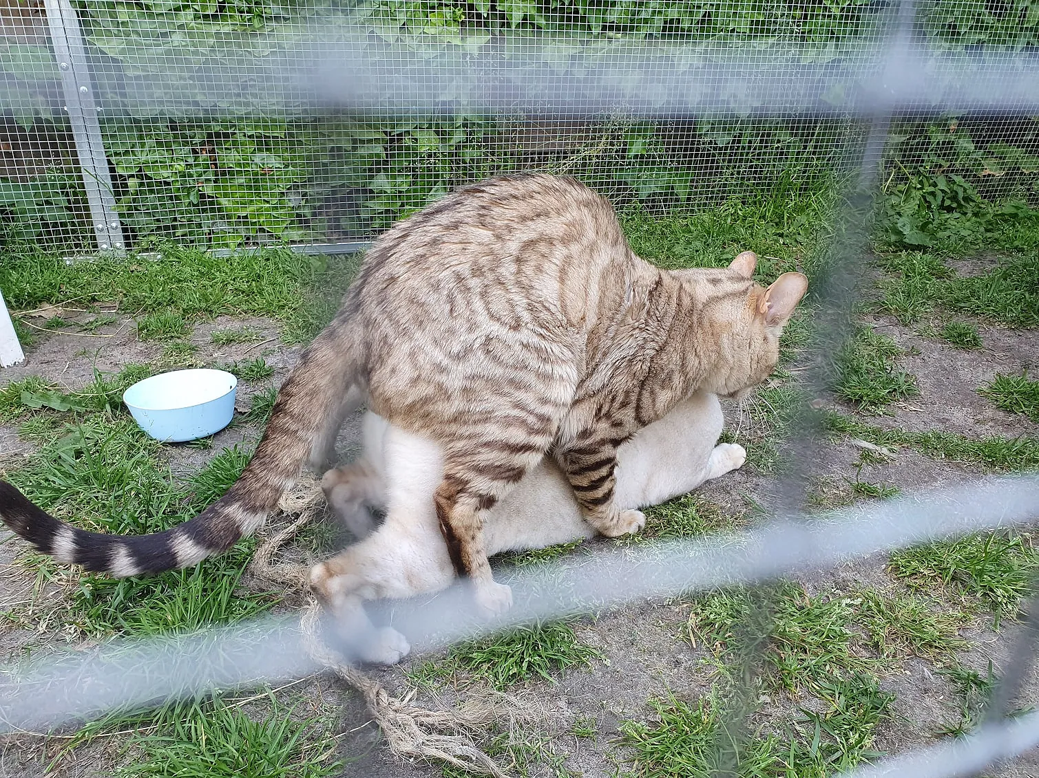 De poezen hebben ongeveer 1x per jaar een nestje, daardoor hebben zij ook een groot deel van de tijd 'vakantie' en leven zij in een van de ruime buitenvolieres. De dekkaters zijn niet allemaal actief, wij zetten ze op 'pauze' door middel van een castratie-implantaat. Het voordeel daarvan is dat ze dan ook samen gehuisvest kunnen worden.