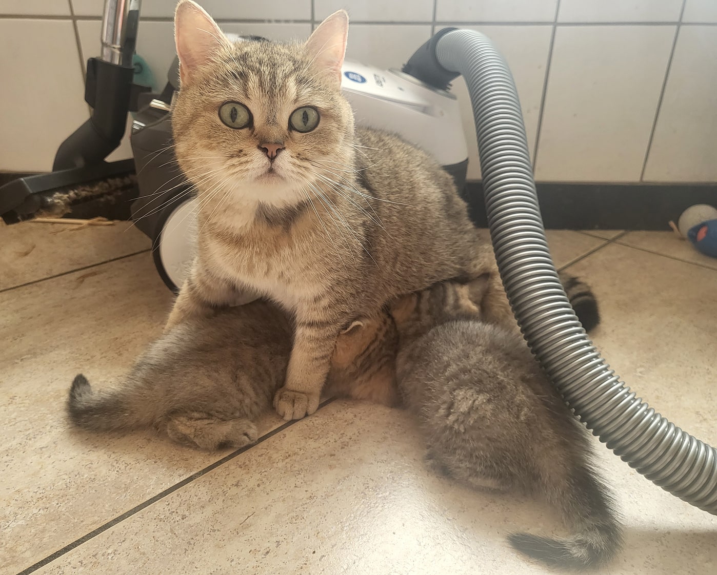 Als een poes hoogzwanger is, krijgt ze haar privé ruimte, waar zij eerst een tijdje alleen met haar kittens kan zijn. Als de kittens in hun eerste leerfase komen, komen ze in huiselijke kring en doen wij er veel mee. De moederpoes blijft de kittens zogen tot zij minstens 12 weken oud zijn. Soms wordt een kitten bij een andere moeder geplaatst, bijvoorbeeld als het verstoten is, of omdat het kitten enigst kind is en beter met een paar broers en zussen opgroeit.