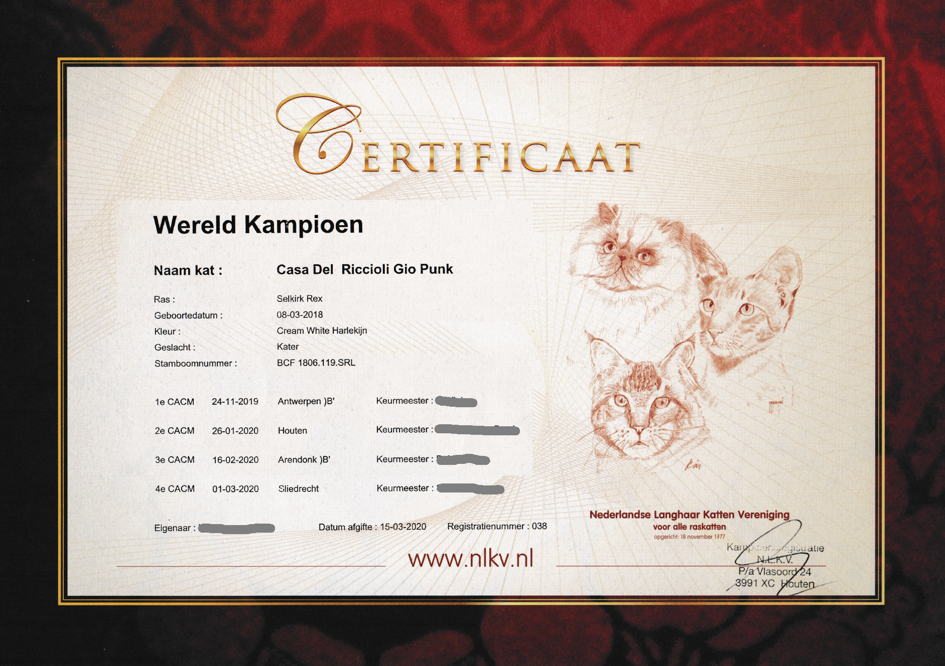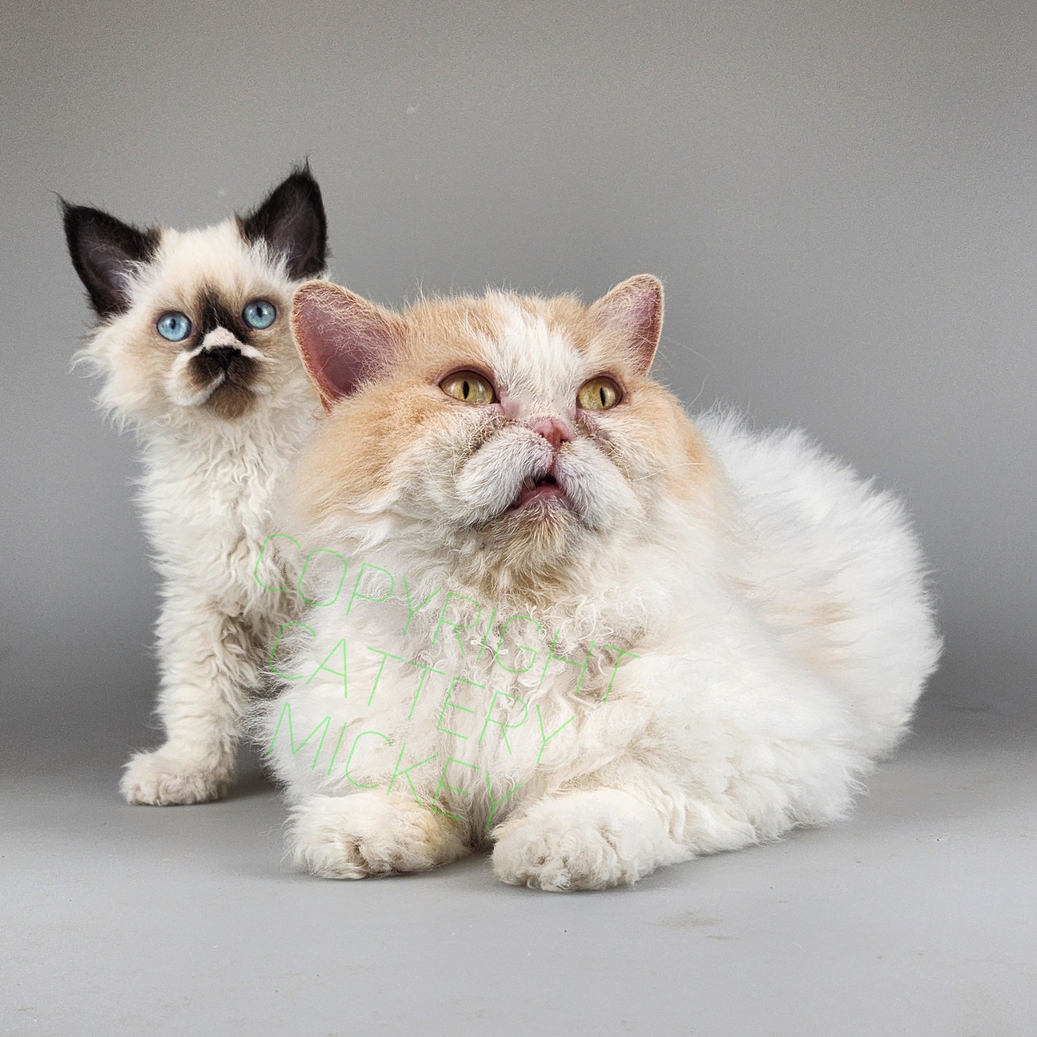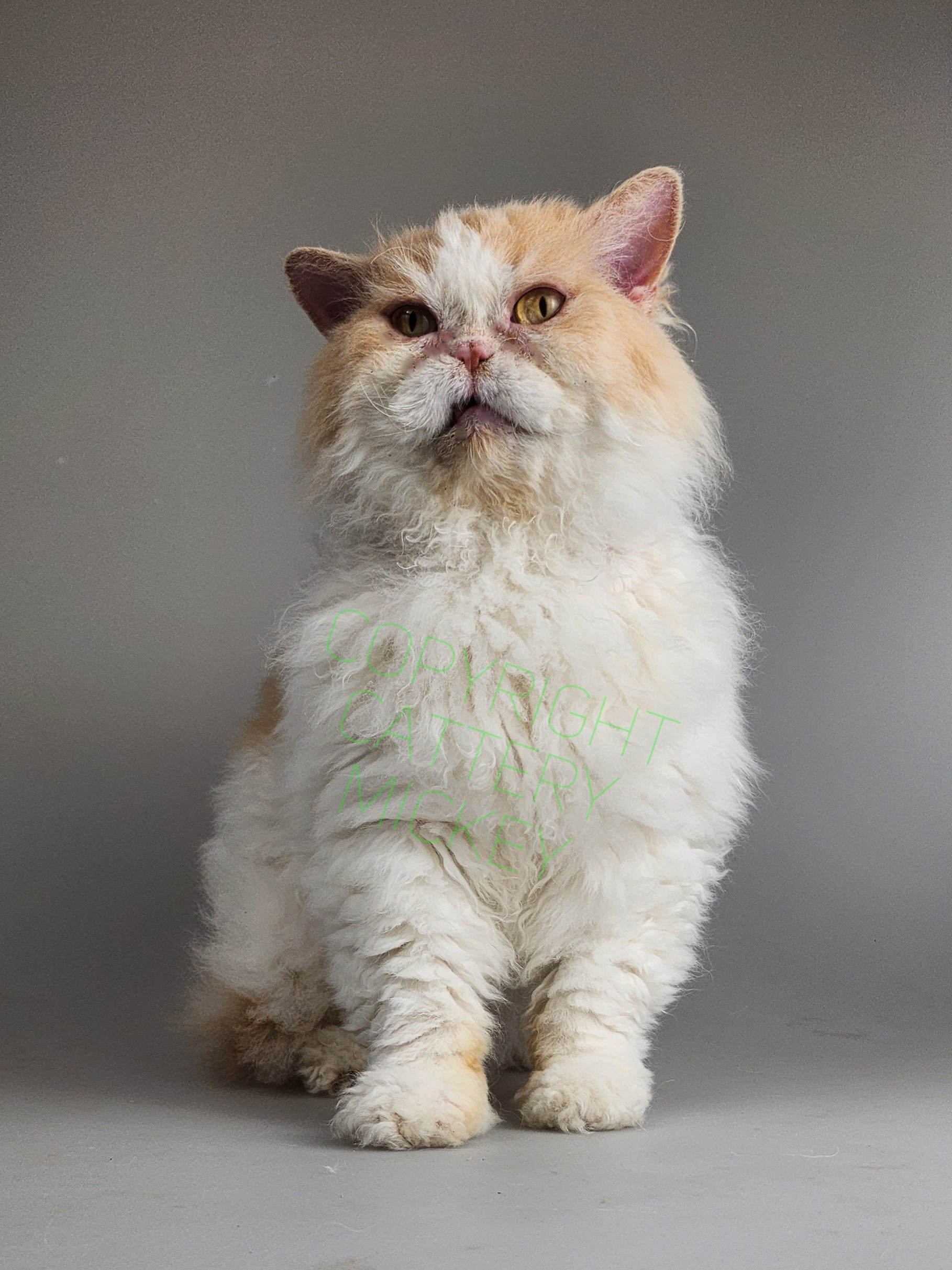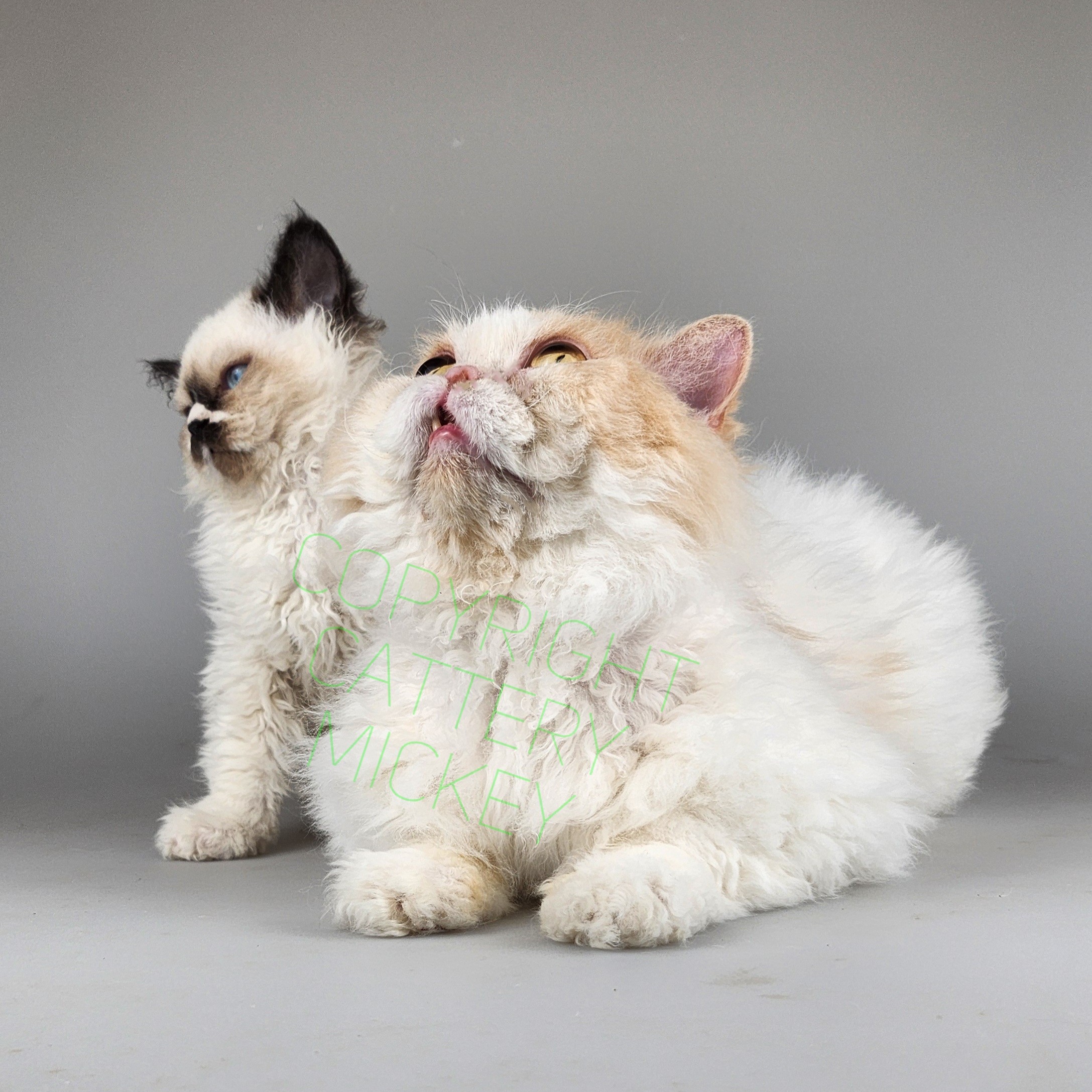 Maak kennis met onze wereldkampioen Punk – onze stoere dekkater met zijn zachte karakter. Punk is een langharige Selkirk Rex in de kleur bicolor crème met wit. Zijn krullen zijn onweerstaanbaar en hij draagt veel bijzondere genen.